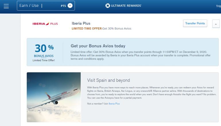Iberia is one of Chase’s Ultimate Rewards® transfer partners. You can transfer your points to Iberia Plus at a 1:1 ratio in an almost immediate transfer. Check for transfer bonuses as Chase rotates bonus partner transfers regularly — in fact, there was an offer for 30% bonus on transfers for Iberia in late 2020.