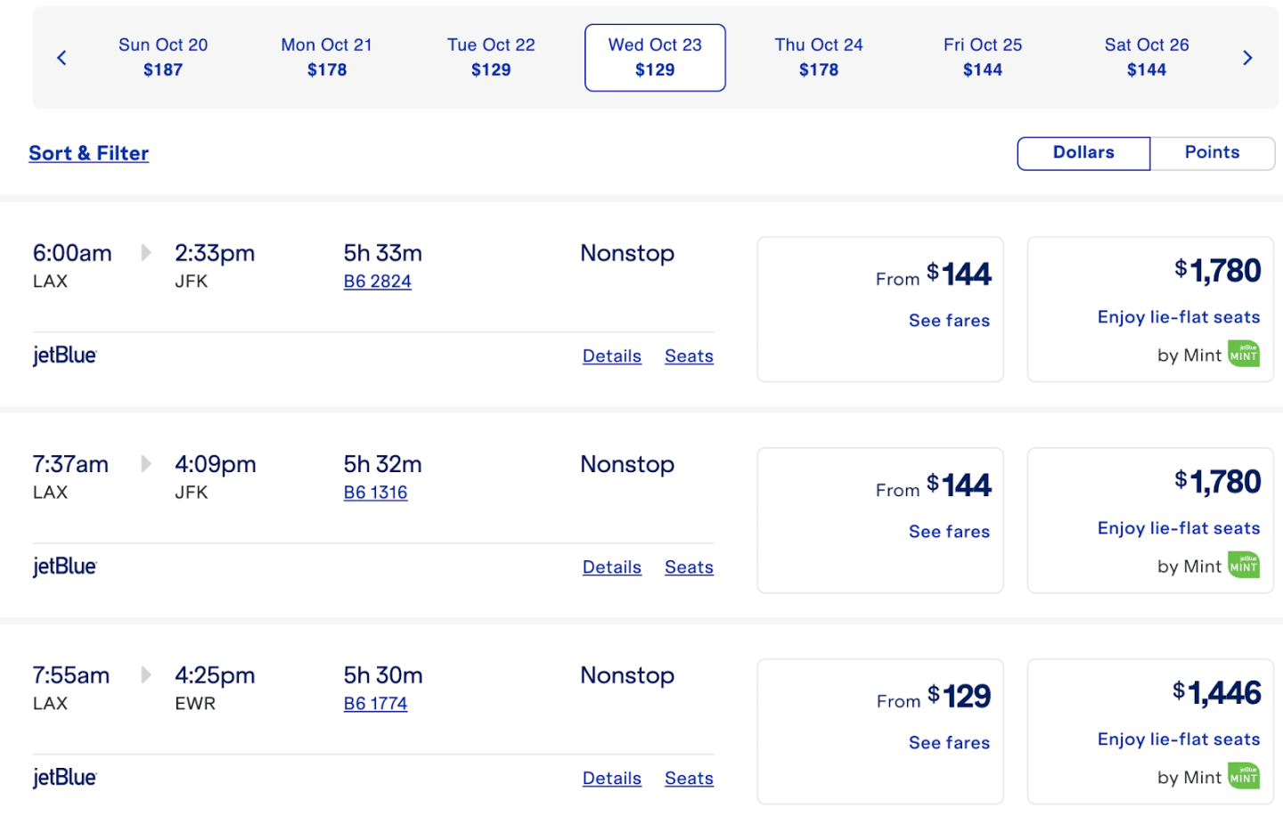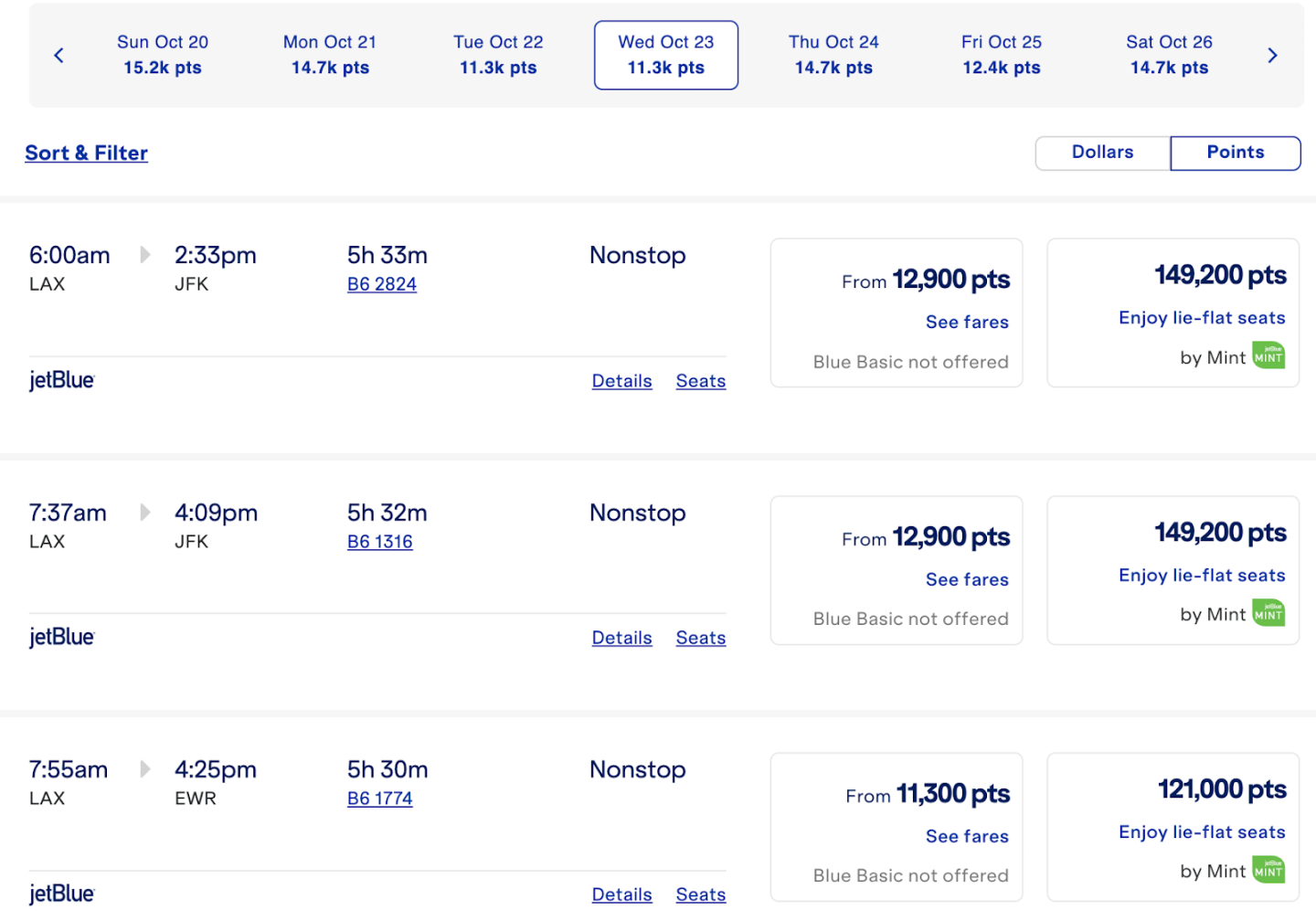 If you want to apply points to your fare but don’t have enough to cover the whole thing, here’s another bit of good news: JetBlue airfares, including those in Mint class, can be paid for with a combination of cash and TrueBlue points. Here’s a selection of the same flights, but with points.
