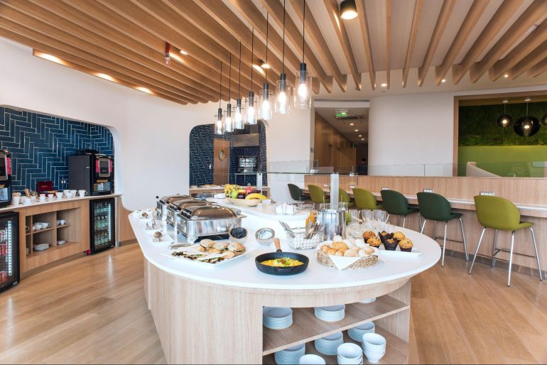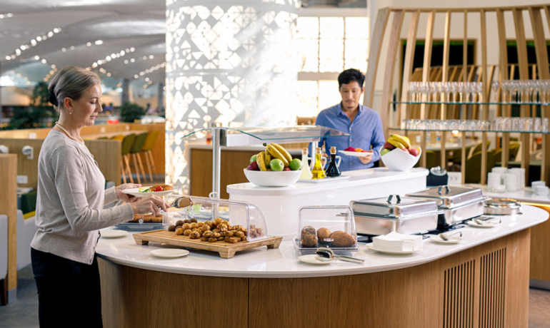 The lounge features a self-service bar including a dedicated wine selection, buffet with hot and cold meals, and a living wall that features 60 different species of plants. Travelers can also refresh between or before a flight with shower facilities or catch up on work in the business center.