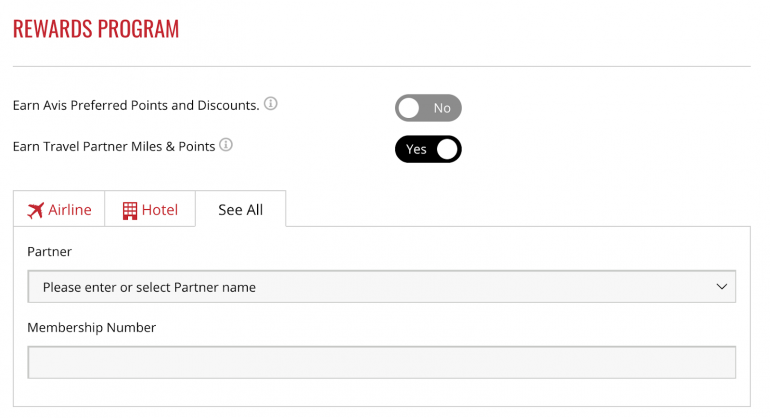 To do that, log in to your Avis Preferred account, click on the rewards tab and toggle between how you want to earn rewards. If you choose the travel partners option, select your airline or hotel from a dropdown and then input your membership number from that program to sync the two accounts.