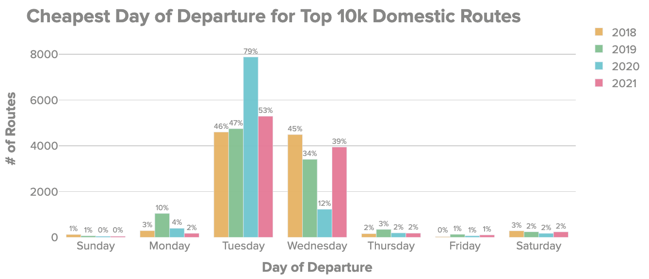 If you’re flying to a wedding that’s held on a Saturday, it can seem natural to leave on Friday and return on Sunday. Yet this option is often the most expensive one. According to airfare data from Hopper, Tuesday and Wednesday are almost always the cheapest days to fly, while Friday is almost never the best time to leave in terms of cost.