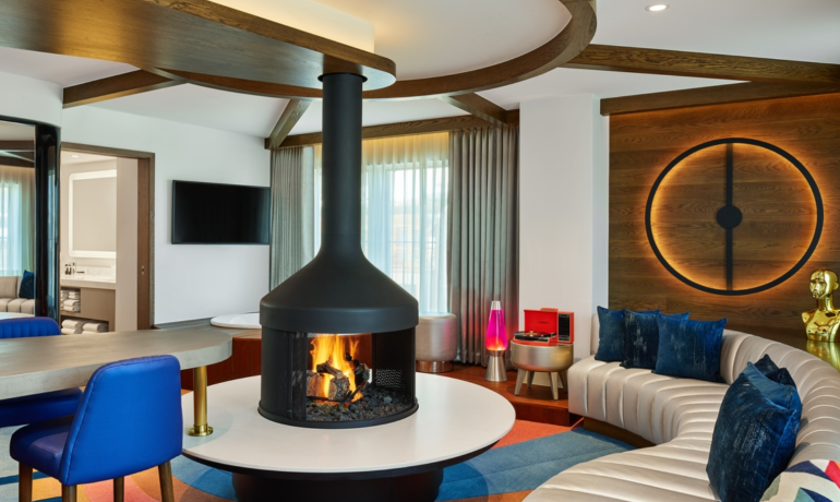 Minibars sit beneath a fireplace-style decoration and come stocked with local products, and side tables double as small desks or dining areas.
