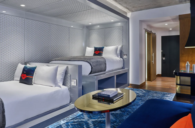 The rooms continue W’s trendsetting style with super-soft bedding, easy-access power outlets and sofa or armchair seating. King rooms are standard, but families and friends traveling together can opt for rooms with bunk beds. Some have as many as four queen bunk beds in the room, which can help cut down on the cost of staying in the heart of Aspen.