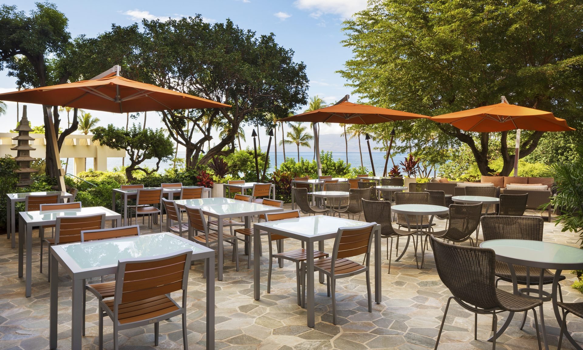 The Hyatt Regency Maui Resort and Spa Club Lounge has outdoor seating with ocean views. Image courtesy of Hyatt.