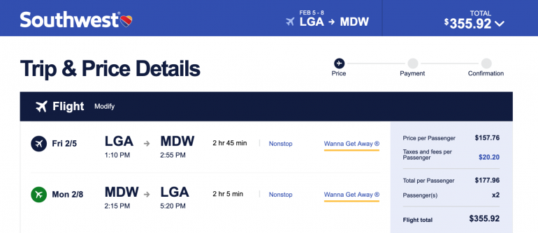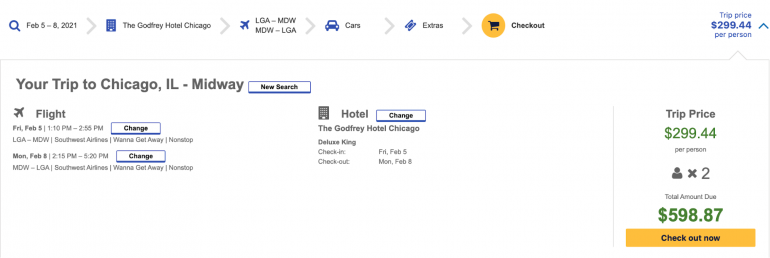 For this long-weekend couples’ trip to Chicago, the Southwest Vacations total is $598.87 or $299.44 per person.