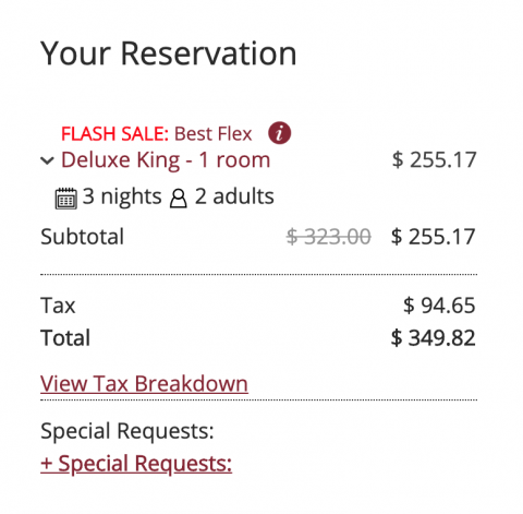 The hotel reservation total is $349.82. This price also includes a discount because of a promotion that the hotel is running.