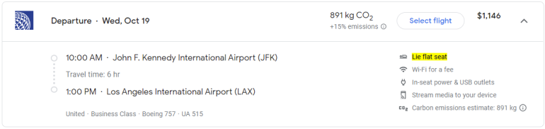Google Flights will show details such as seat pitch, Wi-Fi availability, power availability and more in the flight details for each flight. Just select the down arrow on a particular flight result to see all of these details. Business class seats that lie flat will be labeled with a "lie flat seat" designation.