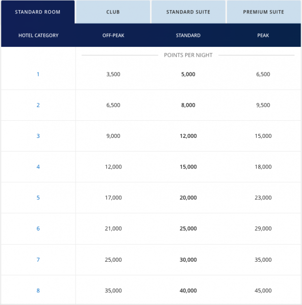 Members pay the fewest points for off-peak dates, and rates increase for both standard or peak dates. You can also redeem points for all room types. There are separate charts for standard rooms, rooms with club level access, standard suites and premium suites.