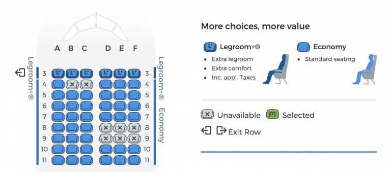 However, there’s no way to see the cost of a given seat without selecting it. In this case, the “extra legroom” seats in the front of the cabin cost $24 each way, while the regular economy seats cost $10-$19, depending on their location.