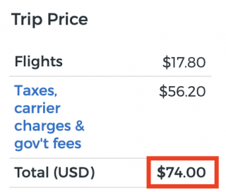 Circling back to the “$74” round-trip base fare, you can see that bringing a carry-on and checked bag, even when paid in advance, would add $90 ($25 x 2 + $20 x 2).