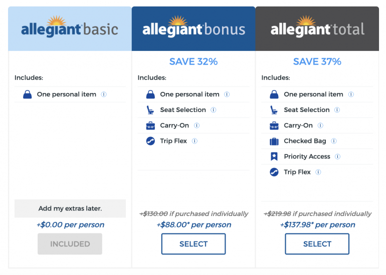 The two bundles are Allegiant Bonus and Allegiant Total. The main differences between Allegiant Basic and Allegiant Bonus boil down to luggage allowance and seat selection. The Allegiant Bonus bundle includes a back-of-the-plane seat assignment and a carry-on bag or checked bag (depending on the flight). The Allegiant Basic fare price includes neither.