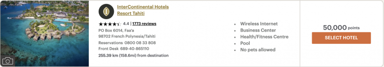 Luxury resorts cost 50,000 to 65,000 points per night and include worldwide locales such as French Polynesia and Australia. For example, InterContinental Tahiti Resort and Spa will currently cost you 50,000 points per night and offers bucket-list resort accommodations and amenities.