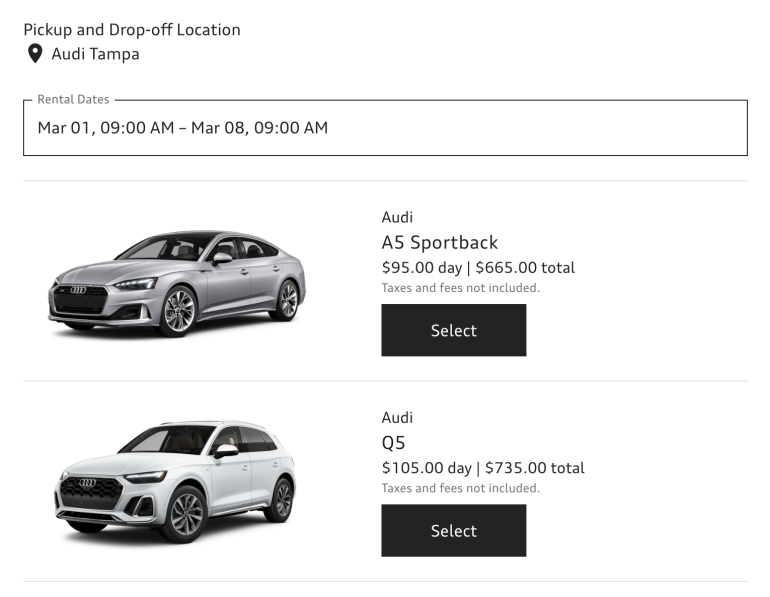 We searched for a vehicle rental for a week in Tampa, Florida, and found the following Audi on Demand pricing.