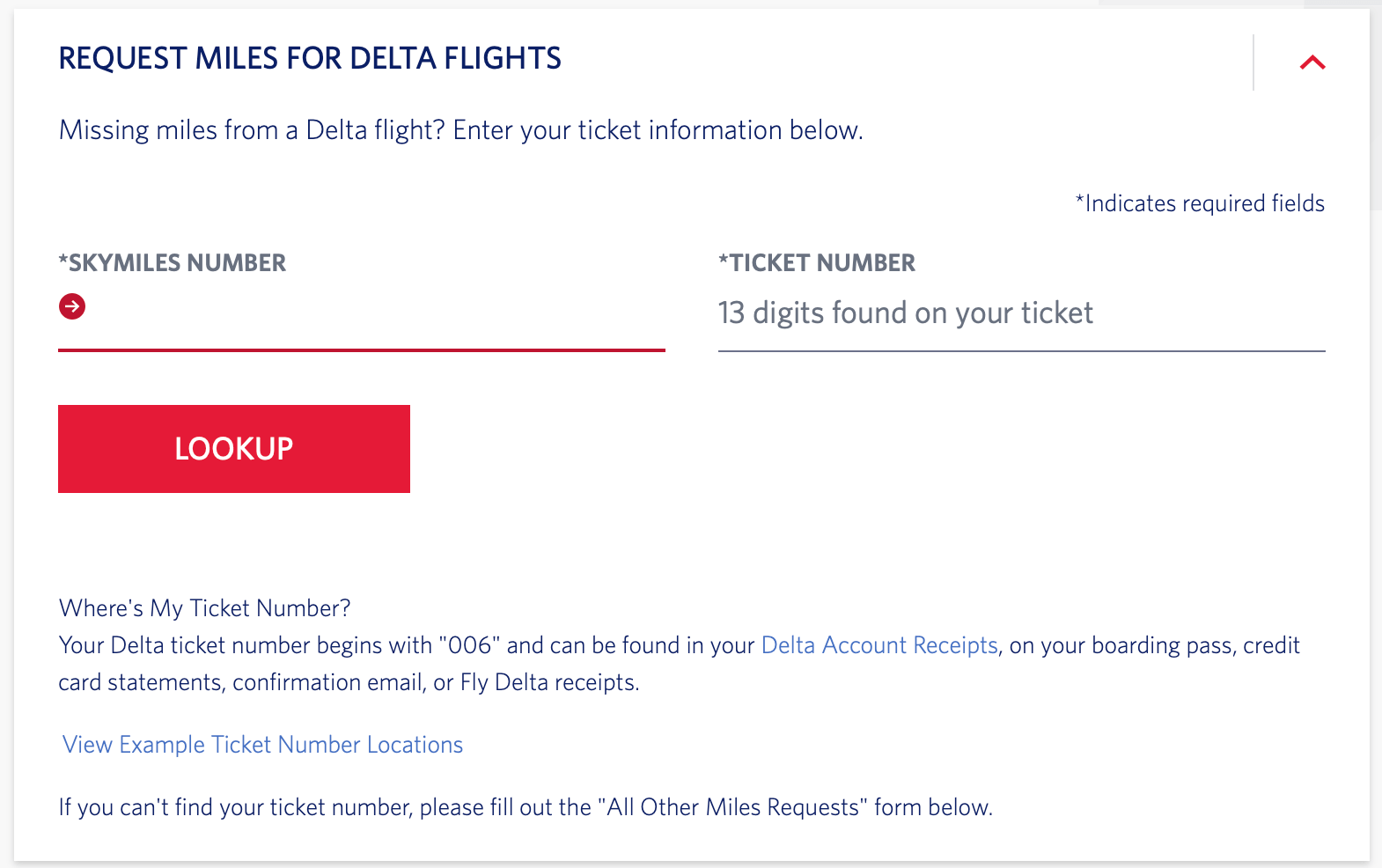 You can submit a mileage claim if it has been at least seven days since the flight (some partner airlines take longer to process miles). If you're requesting missing miles from a Delta flight, enter your SkyMiles number and ticket number (found on your boarding pass or on your ticket receipt) to submit the request.