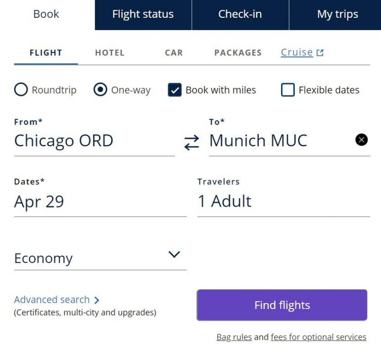 Using a flight from Chicago-O’Hare to Munich as an example, you’ll get results that will show you a range of prices. These are often affected by the class of service and whether the flight is with United or a partner airline.