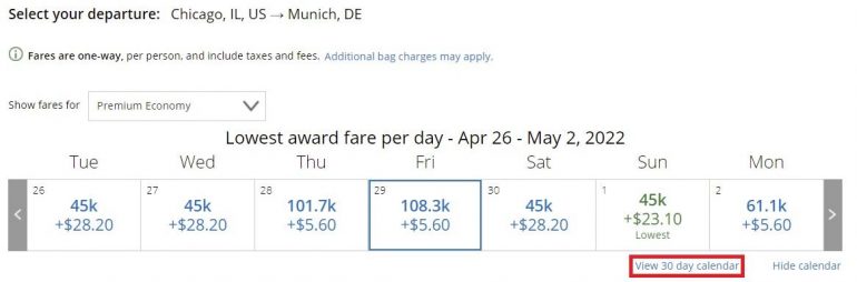 If you want to find the lowest-priced award flights on United and are flexible with travel dates, it would be wise to take advantage of the “View 30 day calendar” feature.