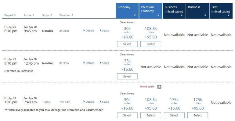 Flexibility is your friend if you want to book the lowest-priced award ticket. For example, if you were set on flying on April 29th, you’d need to use 108,300 miles to fly. However, if you move your travel ahead or back by just a day or two, you would instead only need 45,000 miles.