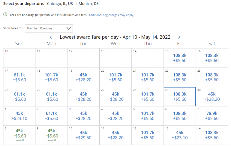 On the date selected, from Chicago to Munich, an economy seat ranges from 30,000 to 33,000 miles, while premium economy is 108,300 miles and business class is 175,000 miles.