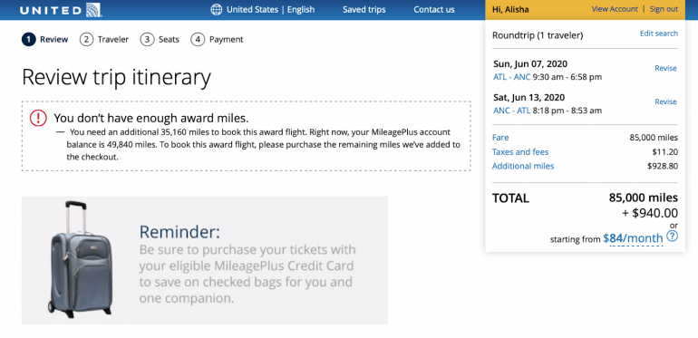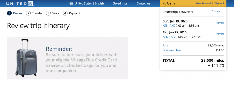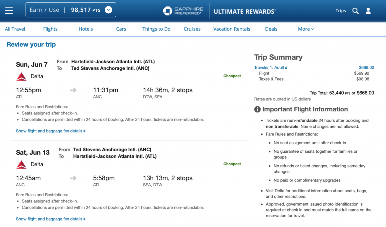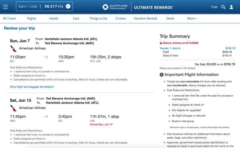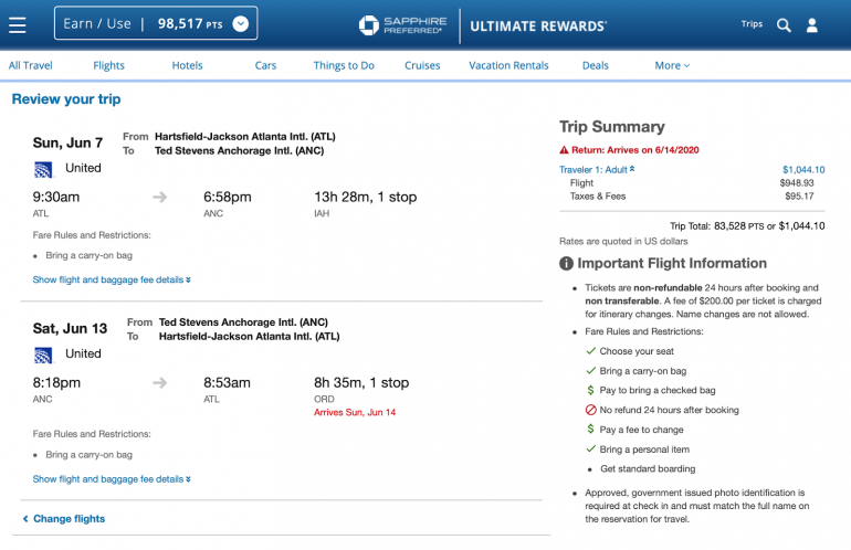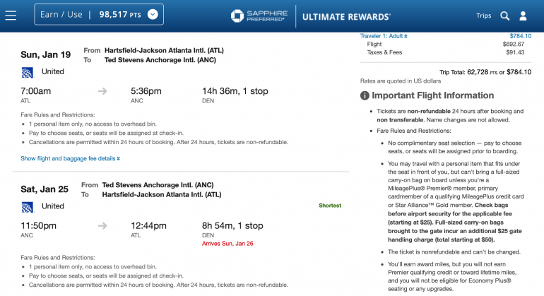 We found this fare for a United award flight from Atlanta to Anchorage at 62,728 Ultimate Rewards® points ($783.10 in cash including taxes and fees). Using United miles, the total required is just 35,000 miles. In this case, it makes more sense to transfer Chase Ultimate Rewards® to United than to redeem points through Chase's travel portal.