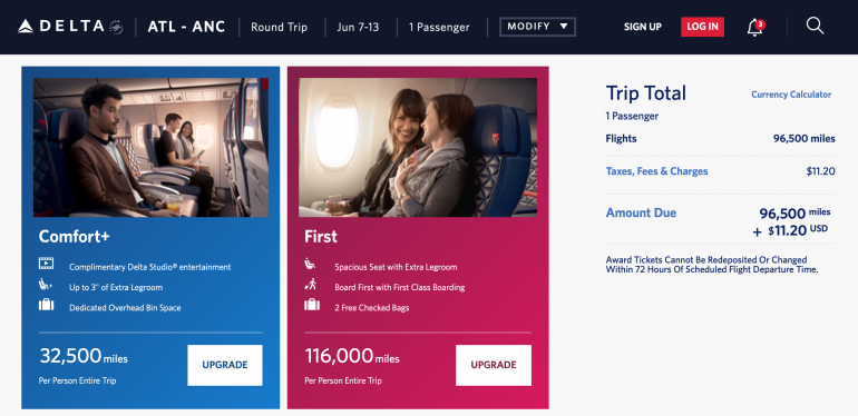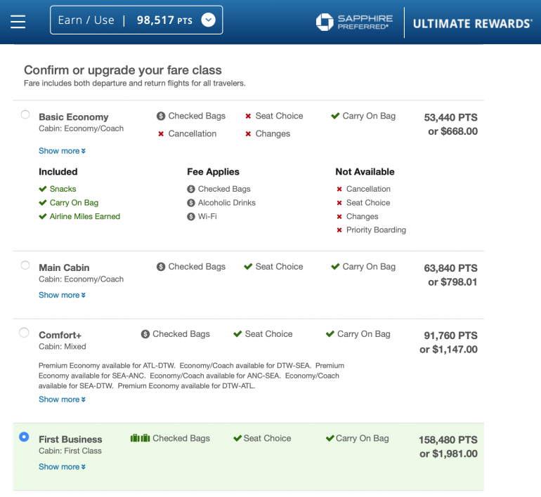 When selecting first class options for the same flights as above, a different result surfaced. Whereas with Chase Ultimate Rewards® a Delta first class flight required 158,480 points (or 198,100 Capital One miles), Delta.com only charged 116,000 miles.