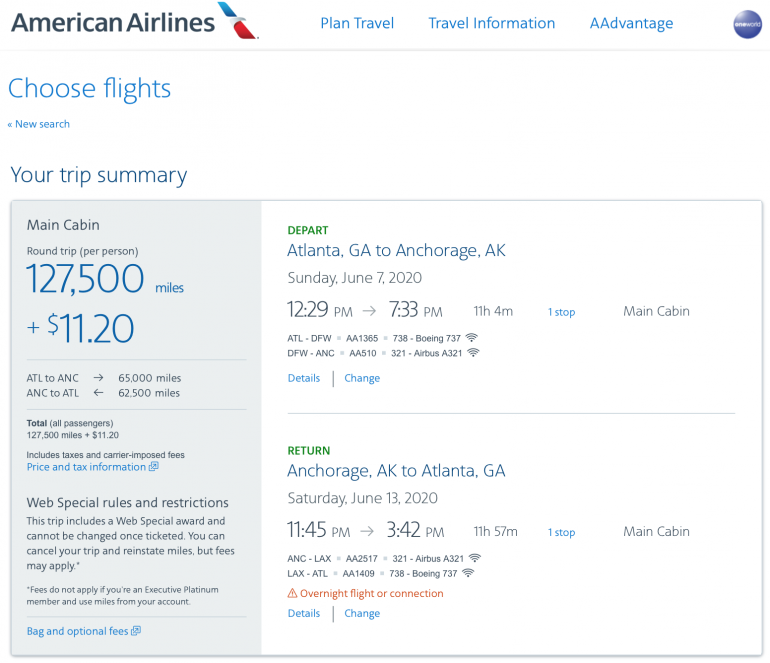 Airlines that still publish an award chart can be easier to predict but don’t always offer the best deals on award flights. Take a look at this flight from Atlanta to Anchorage on Delta (which utilizes a dynamic award system) and American Airlines.