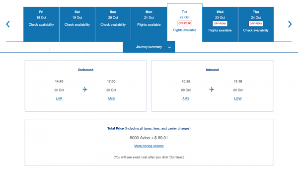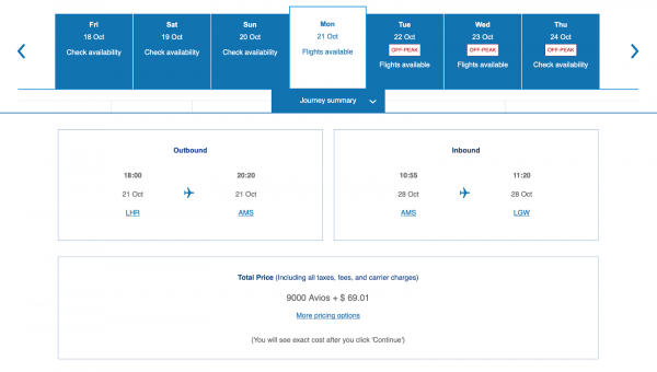 The difference between the fares will vary depending on your destination. In one search, a flight from London to Amsterdam cost 8,000 Avios for a round-trip off-peak award flight and 9,000 for a peak award flight.