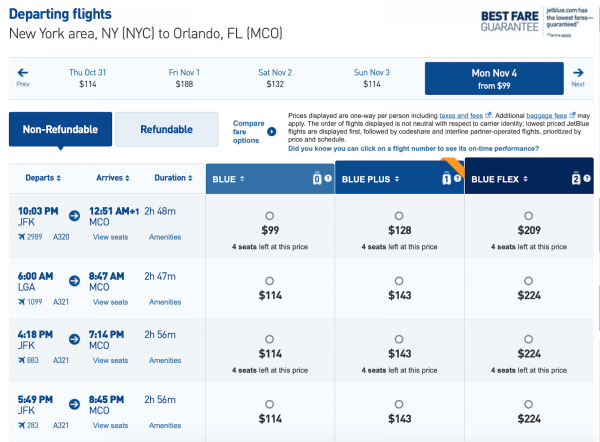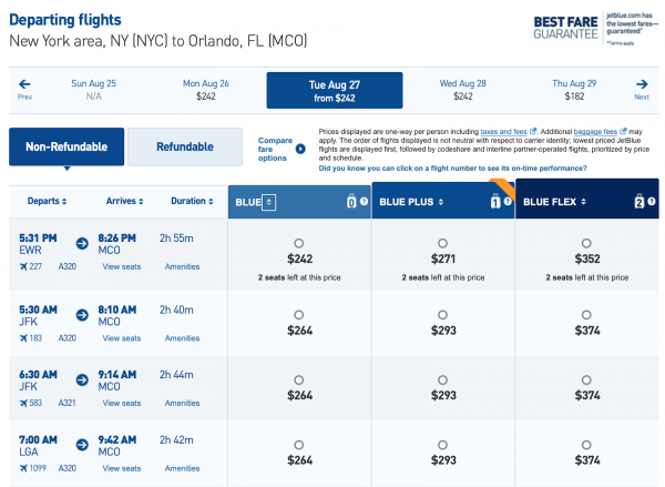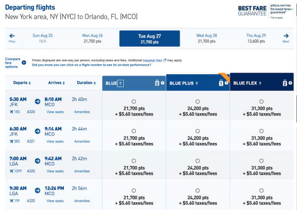 Let’s start with the good news: You can redeem TrueBlue points on any JetBlue flight with no blackout dates. You can also use them for nearly any seat, from Blue Basic (JetBlue’s version of economy) to Mint (JetBlue’s version of first class). That’s great if you want flexibility and convenience out of a frequent flyer program. You cannot redeem TrueBlue points for a Blue Basic fare, which is JetBlue’s version of basic economy.