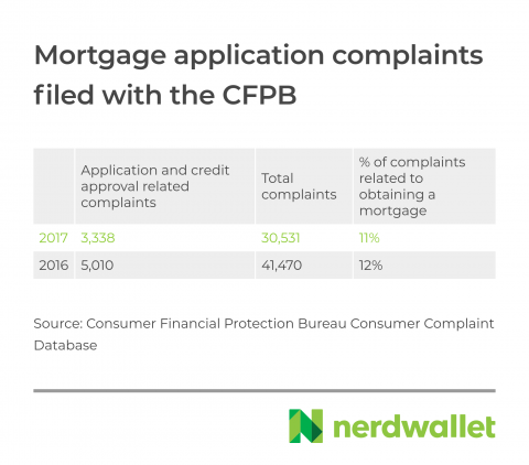 According to NerdWallet analysis of data from the Consumer Financial Protection Bureau, there were some 3,338 complaints filed with that agency related specifically to the mortgage application or underwriting processes in 2017. Most complaints against mortgage lenders fall into the categories of loan servicing, payments, modification and collection, but thousands are directly related to getting a mortgage in the first place.