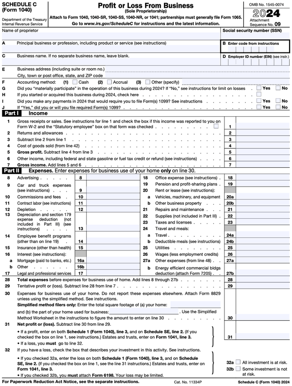Schedule C is an IRS tax form that reports profit or loss from a business. Sole proprietors or single-member LLCs typically use the form.